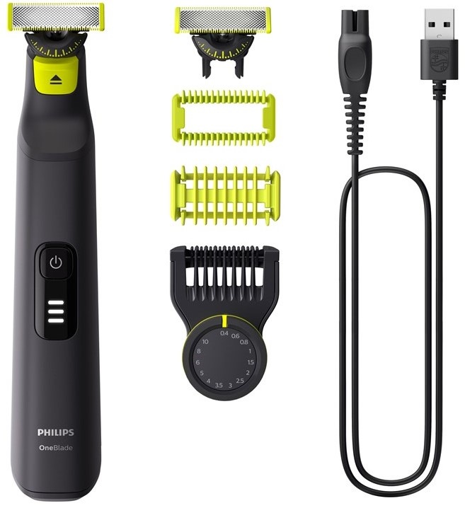 zastřihovač vousů • použití na tvář i tělo • zastřihování, tvarování, holení • akumulátorový provoz • doba provozu 90 min • nabíjení 1 hodina • inovativní oboustranný břit OneBlade 360 • technologie OneBlade oholí vousy všech délek • zastřihování vousů ve 14 délkách • mokré a suché použití • LED indikátor baterie • voděodolný • ergonomická rukojeť • šetrné ošetření všech partií • ochranný nástavec pro citlivé oblasti • hřeben na tělo • náhradní břit OneBlade • kabel USB-A (adaptér není součástí balení)