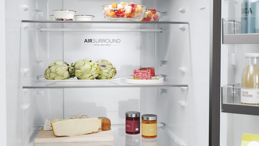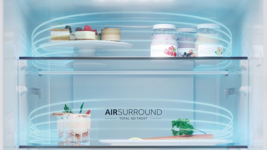 Systém Air Sorround se stará o perfektní cirkulaci vzduchu v chladničce prostřednictvím ventilátoru, jenž studený vzduch distribuuje do celého prostoru. Konstantní teplotu pak pomáhají udržovat elektronická čidla, aby potraviny vydržely déle čerstvé a plné vitamínů. Technologie Total No Frost zamezuje tvorbě námrazy, což má pozitivní vliv na spotřebu a také to znamená méně starostí s údržbou. Současně díky rovnoměrnému chlazení vydrží potraviny déle chutné a čerstvé.