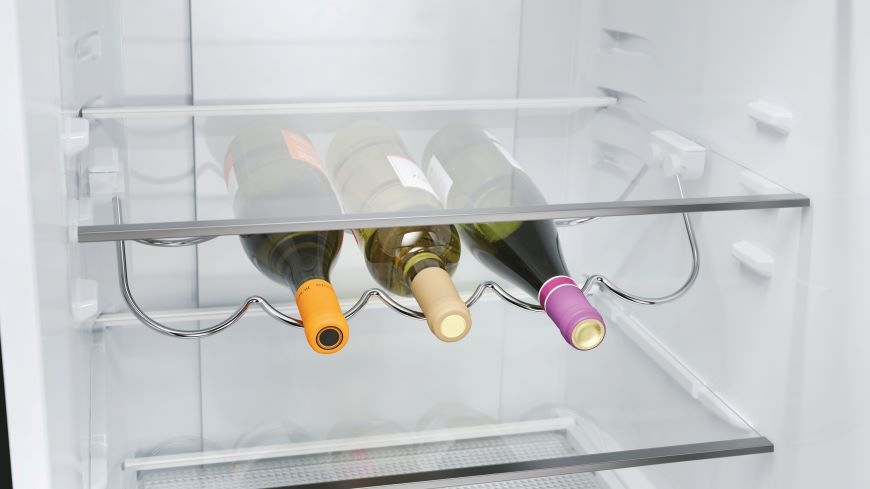 Chladnička Haier HDW3618DNPK myslí na všechno a ví, že každá věc má své místo. Proto má v policích zabudovaný praktický držák na lahve, který lze sklopit zpátky do vodorovné polohy, pokud je třeba zvětšit prostor police.