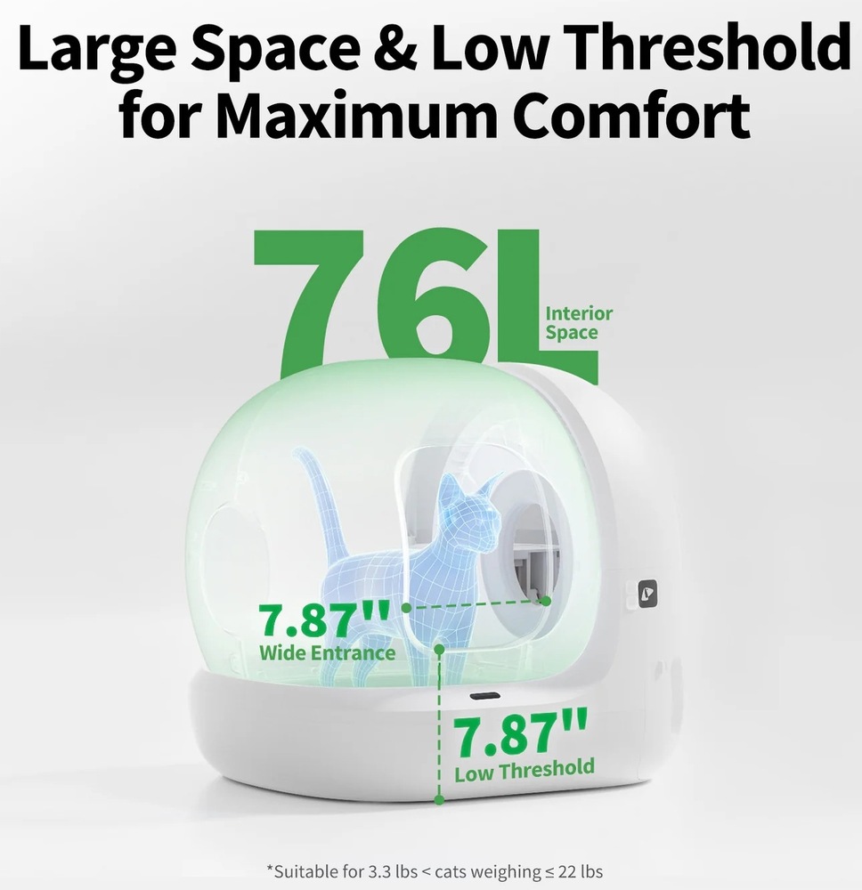 Revoluční automatická toaleta pro kočky, která přináší zcela nový standard hygieny, pohodlí a bezpečí. Díky prostornému interiéru se hodí i pro větší plemena, zatímco nízký vstup usnadňuje přístup menším, starším nebo méně pohyblivým kočkám. Nově vyvinutý válec s technologií ShieldBase poskytuje 360° hermetické těsnění, které zabraňuje úniku tekutin či zápachu. S odpadní nádobou o objemu 7 litrů můžete na pravidelné vybírání zapomenout až na 15 dní. Díky inteligentnímu systému trojité deodorace zůstává okolí toalety vždy svěží. S mobilní aplikací PETKIT získáte plnou kontrolu nad nastavením toalety odkudkoliv. PURAMAX 2 dokáže navíc sledovat návyky při používání toalety.