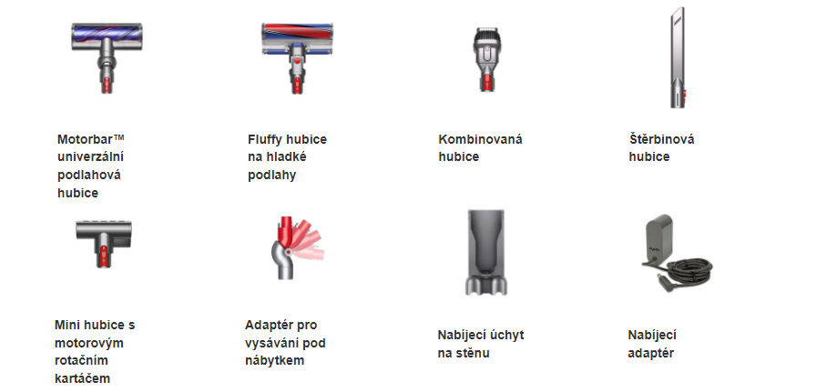 tyčový vysavač • sací výkon 185 aW • šestivrstvý filtrační systém • bezdrátový provoz (60 min) • LCD displej • technologie proti namotávání vlasů • 3 výkonové režimy • snadné vysypávání nádobky • technologie Radial Root Cyclone • podlahová hubice Motorbar • podlahová hubice Fluffy • mini hubice s motorovým rotačním kartáčem • kombinovaná kartáčová hubice • štěrbinová hubice • adaptér pro vysávání pod nábytkem • úchyt na stěnu