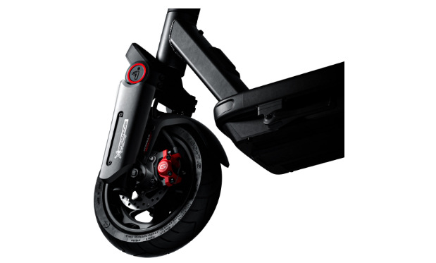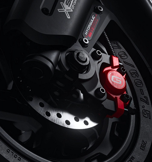 Přední a zadní kotoučová brzda s dvojitým pístkem a čtyřmi destičkami garantují bezpečné a plynulé zastavení i při vyšší rychlosti nebo v dešti.