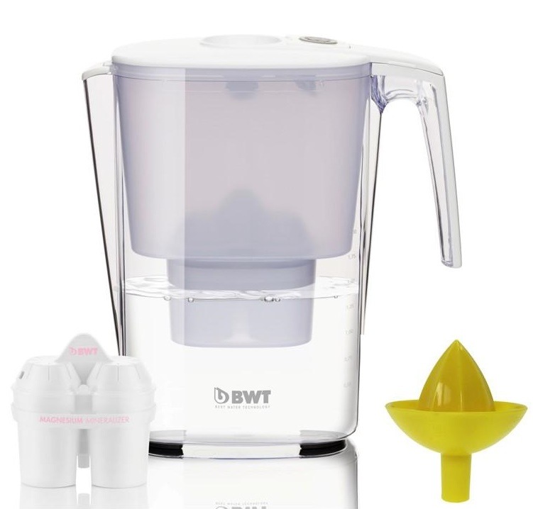 Čerstvou vodu se sníženým obsahem chlóru si s konvicí BWT můžete užívat každý den. Na víku konvice je mechanický indikátor výměny filtru, který Vám připomene čas pro výměnu filtrační vložky. Balení obsahuje filtr a ruční odšťavňovač na citrusy.