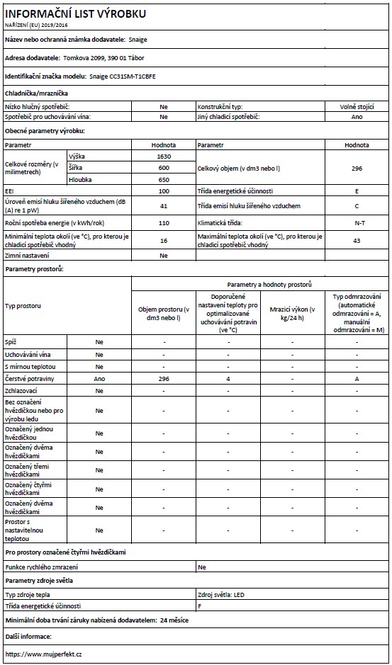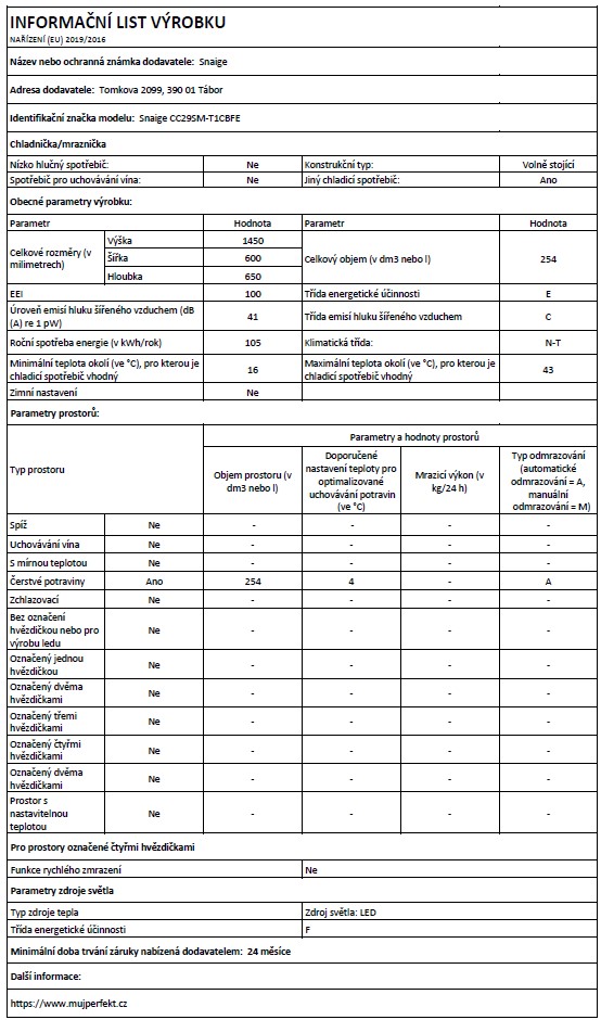 jednodveřová chladnička • výška 168,4 cm • objem chladničky 432 l • kapacita 354 lahví 0,5l PET • energetická třída B • zapuštěné madlo • vyměnitelné těsnění • samozavírací dveře • chlazení cirkulujícím vzduchem • mechanické ovládání otočným voličem • možnost změny směru otevírání dveří • hlučnost 50 dB • V × Š × H: 168,4 × 74,7 × 76,9 cm