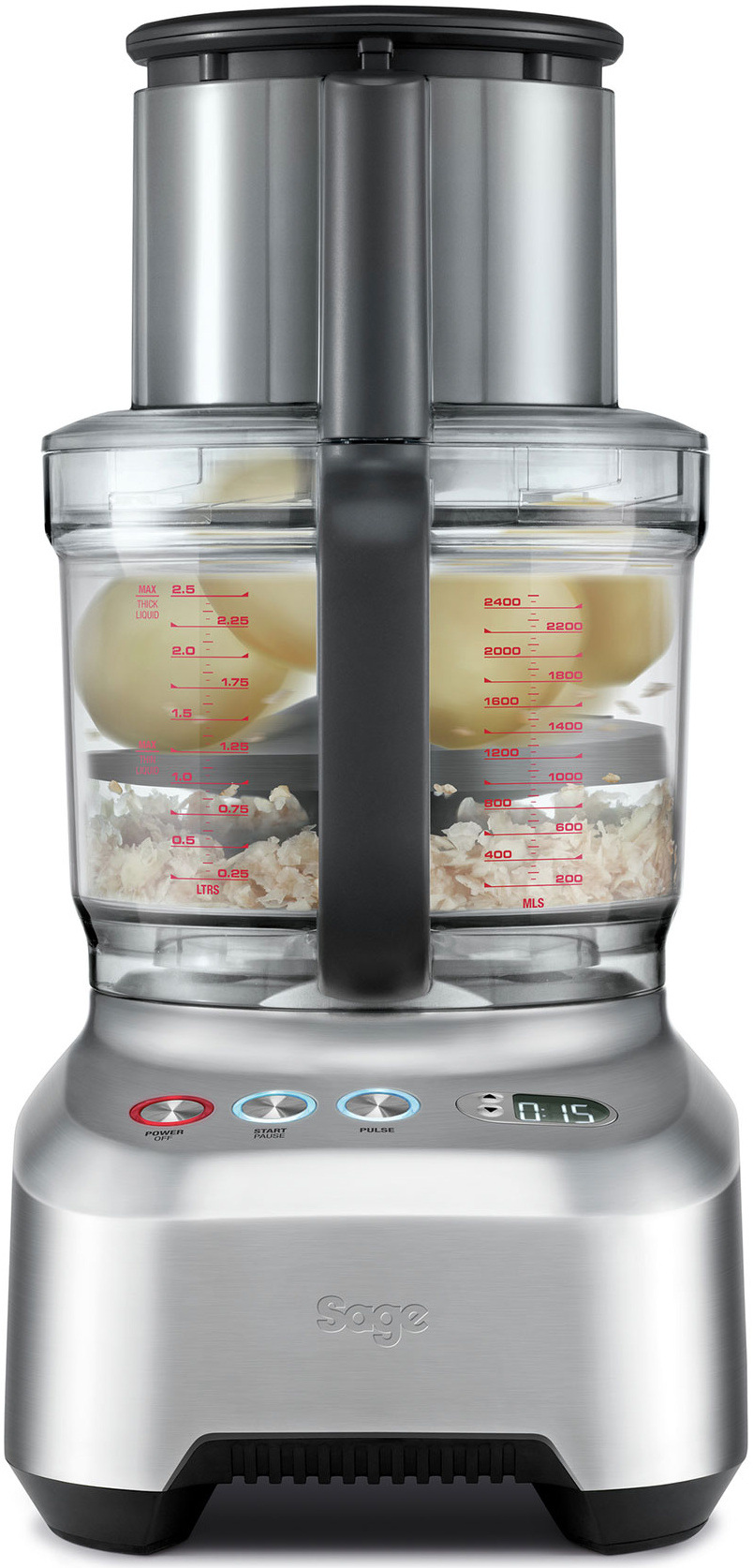 Univerzální kuchyňský robot SAGE BFP820 vás překvapí svým mnohostranným použitím, se kterým velmi usnadní a zrychlí práci v kuchyni. Seká potraviny najemno i nahrubo, nakrájí jak jemné proužky, tak ty silné například na hranolky, šlehá, hněte těsto, oškrábe brambory a může se pochlubit také nakrájenými pravidelnými kostičkami do salátu. Kuchyňský robot SAGE je vybaven výkonným indukčním motorem o příkonu 2 000 W. K ovládání slouží tlačítka a LCD displej. Funkce PULSE spustí krátké impulzy na plný výkon. Díky časovači je možné nastavit požadovanou dobu zpracování potravin, po jejím uplynutím se spotřebič automaticky vypne.