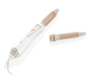kulmofén horkovzdušný • příkon 400 W • 2 tvarovací kartáče (malý - průměr 16 mm, velký - průměr 19 mm) • 2 teplotní nastavení • 2 rychlostní nastavení • studený vzduch • ochrana proti přehřátí • otočný kabel 1,8 m • poutko na zavěšení • barva bílá