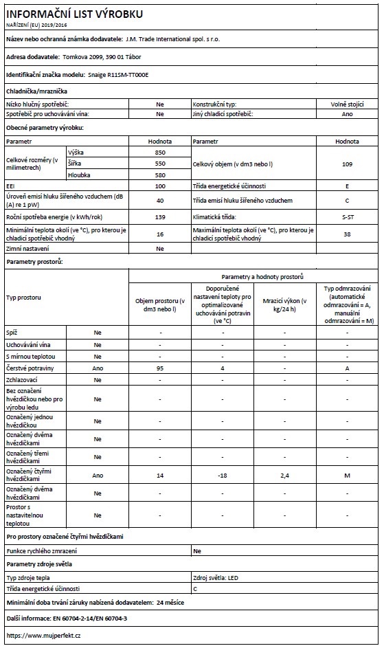 jednodveřová chladnička s mrazákem • výška 85 cm • objem chladničky 95 l / mrazničky 14 l • energetická třída E • 5 let záruka na kompresor • LED osvětlení • nastavitelný termostat • výškově stavitelné nožky • možnost změny směru otevírání dveří • hlučnost 40 dB • V × Š × H: 85,0 × 55,0 × 58,0 cm