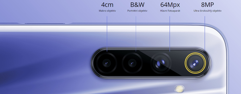 Realme 6 na zadní straně nabízí hned čtyři fotoaparáty, přičemž každý má jiný účel. Hlavní práci ale odvádí 64Mpx snímač, který pořídí nádherné fotografie za jakýchkoli podmínek. Využijete ale i ultraširokoúhlý fotoaparát se záběrem 119 stupňů, makro objektiv pro focení detailů a také portrétní B&W snímač.