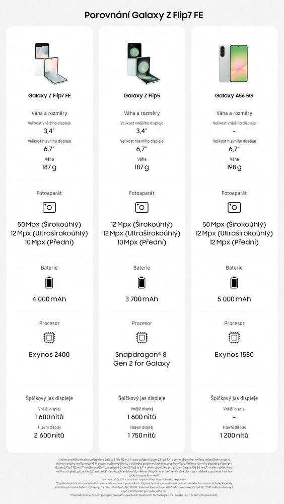 Galaxy Z Flip7 FE přináší ikonický skládací design a skvělý styl. Ve složeném stavu se pohodlně vejde do kapsy, rozložený ale nabídne špičkový 6,7" displej s jasem až 2 600 nitů, prémiovou výbavu a moderní funkce vlajkových modelů. Dokazuje to kromě jiného i rychlým čipem Exynos 2400, dlouhou výdrží zásluhou baterie o kapacitě 4 000 mAh nebo skvělým fotosetem se 3 objektivy.