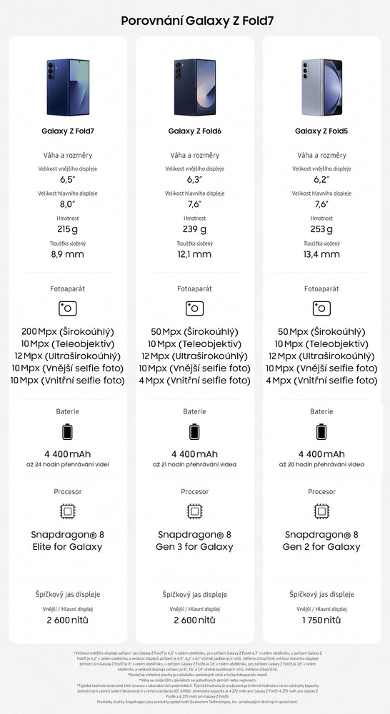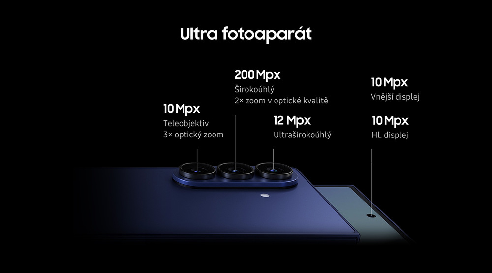 smartphone • 8" úhlopříčka • Dynamic AMOLED 2X displej • 2520 × 1080 px • obnovovací frekvence 120 Hz • procesor Snapdragon 8 Elite for Galaxy (8jádrový – až 4,32 GHz) • paměť RAM 12 GB • interní paměť 256 GB • zadní fotoaparát 50 + 12 + 10 Mpx • optická stabilizace • přední fotoaparát 10 + 4 Mpx (f/2,2) • nano SIM + eSIM • NFC • Bluetooth • GPS • Wi-Fi • USB-C • 5G • čtečka otisku prstů na těle • Android 16 • kapacita baterie 4 400 mAh • bezdrátové, reverzní, rychlonabíjení 25 W
