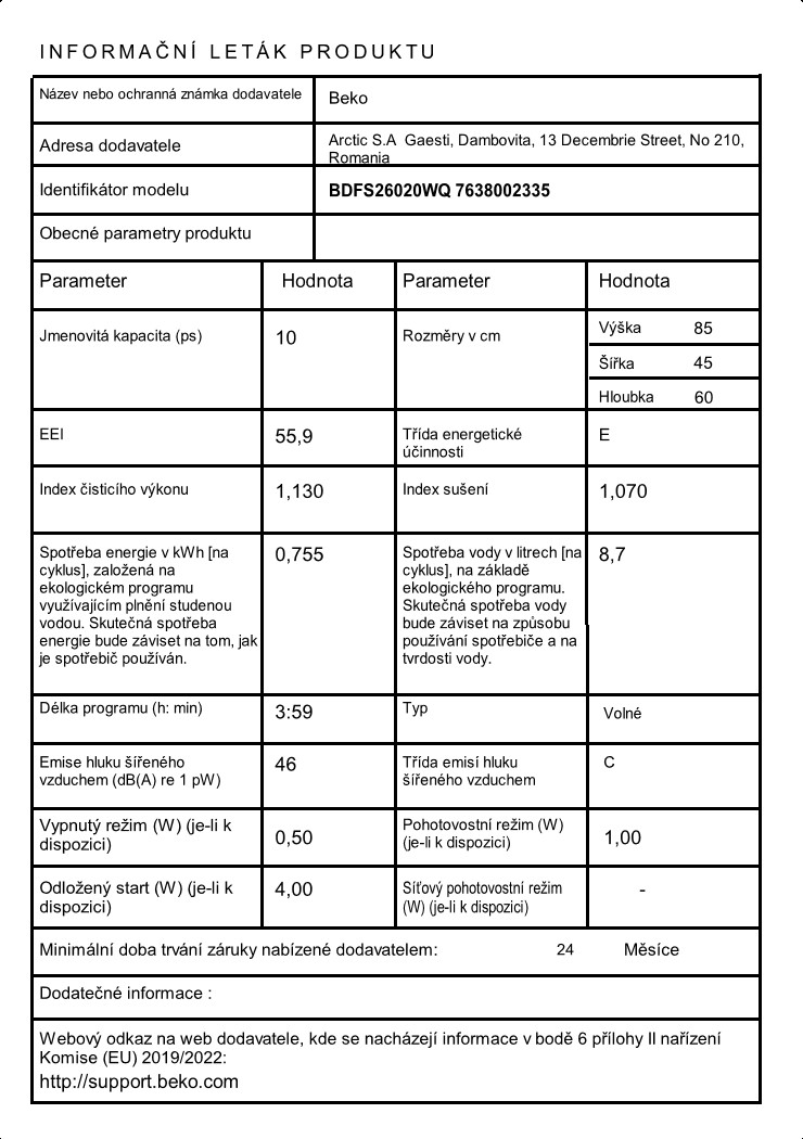 myčka nádobí • s předním panelem • šířka 60 cm • příborový košík • 13 sad nádobí • energetická třída E • hlučnost 47 dB • funkce RychléMytí – možnost zkrácení programů • funkce Tablety 3 V 1 – automaticky přizpůsobí cyklus mytí • funkce odložený start (0–24 h) • bezpečnostní prvky: ochrana proti úniku vody • V × Š × H: 84,5 × 59,9 × 59,7 cm