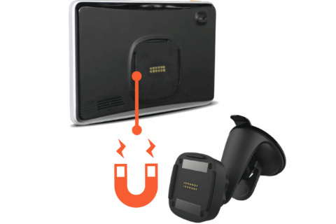 Připevněte navigaci na magnetický držák, který ji spolehlivě udrží i při vysokých rychlostech a v ostrých zatáčkách. Držák se snadno instaluje a navigaci kdykoliv snadno nasadíte i sundáte, když z auta odcházíte, aby nedošlo k jejímu odcizení. Kromě samotného upevnění navigace můžete přes držák přístroj také nabíjet.