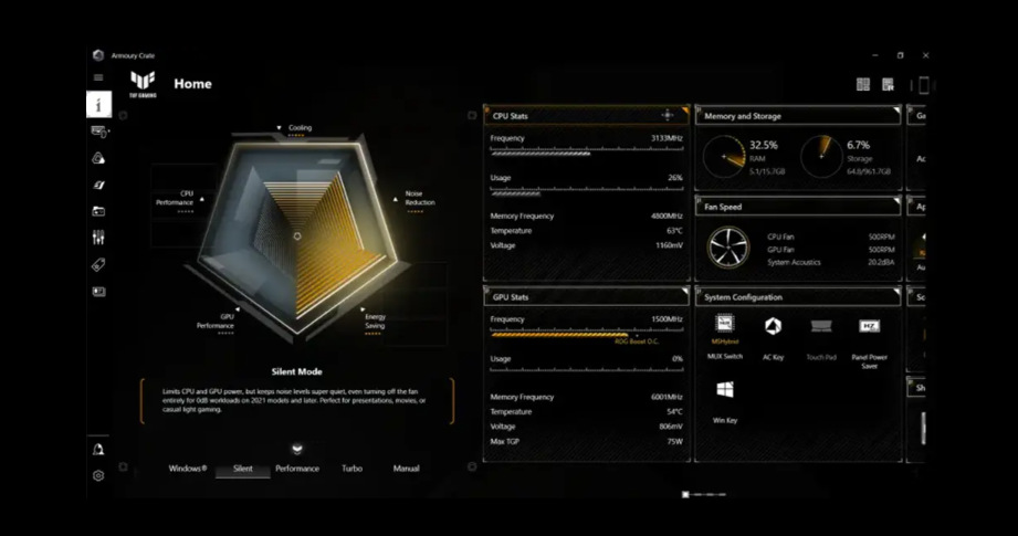 Pomocí Armoury Crate nastavíte osvětlení, výkonové profily i zvuk. Automatické přepínání scénářů zajistí optimální nastavení pro každou hru.