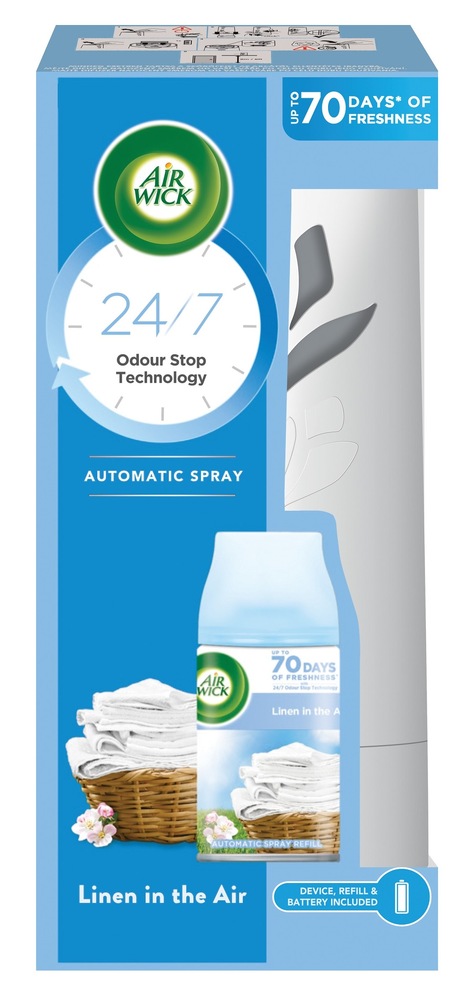 automatický osvěžovač vzduchu • náplň Prádlo ve vánku 250 ml • tři nastavení intenzity vůně • součástí balení 2× AA baterie • výdrž až 60 dní