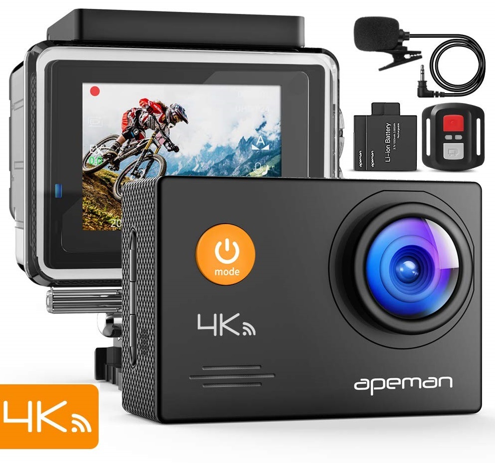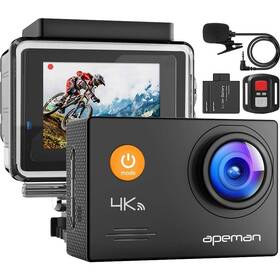 Outdoorová kamera Apeman A79 vám pomůže zaznamenat každý výlet, dovolenou s rodinou i sólo dobrodružství na druhém konci světa. Natáčí videa ve vysoké 4K kvalitě a umí snímat fotografie s rozlišením až 16 Mpx. Můžete se s ní i potápět, stačí ji umístit do přiloženého vodotěsného pouzdra. Záznamy se ukládají na microSD kartu (nutno dokoupit samostatně). Kamera podporuje karty třídy 10 a vyšší s kapacitou 8 až 64 GB. Součástí bohatého příslušenství je mimo jiné také dálkové ovládání (hodinky) a externí mikrofon.