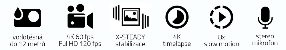 outdoorová kamera • video 4K při 60 FPS / Full HD při 120 FPS • širokoúhlý objektiv 170° • světelnost f/2.8 • stabilizace obrazu X-STEADY • 20Mpx fotografie • Wi-Fi • ovládání přes mobilní aplikaci • 1 350mAh baterie • slot na kartu microSD (max. 128 GB) • vodotěsná do 12 m, s pouzdrem do 30 m • 2" dotykový displej • 1,4" přední displej • microHDMI • microUSB