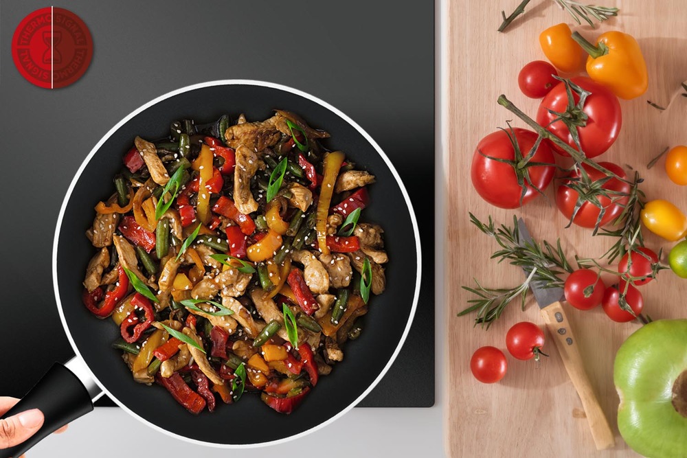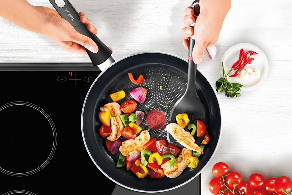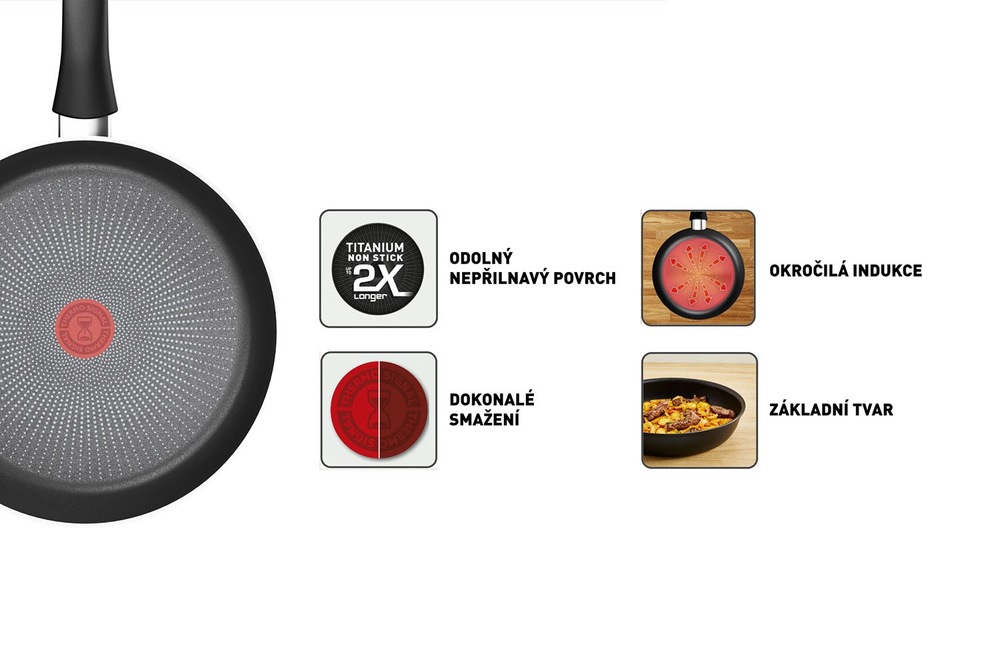 Vysoce kvalitní povrch Tefal Titanium vyniká mimořádnou odolností, vydrží až dvakrát déle než u standardního povrchu Tefal. Díky mimořádné nepřilnavosti je možné používat minimum tuku, nebo připravovat pokrmy zcela bez tuku. Nechybí ani již tradiční technologie Tefal Thermo-Signal™ – červený bod, který se zbarví do plné červené při dosažení optimální teploty pro vaření.