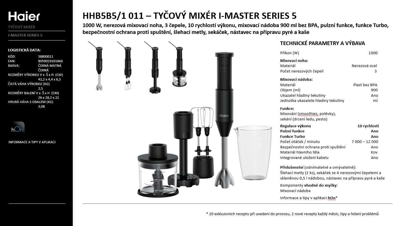 Tyčový mixér Haier HHB5B5/1 011 z řady I-Master Series 5 je dokonalý kuchyňský pomocník spojující špičkovou technologii s precizním designem. Využít můžete 3 ostré nerezové čepele na mixovací noze, 2 šlehací metly, nástavec na pyré či kaše a sekáček s 4 čepelemi. Skleněná sekací nádoba s kapacitou 500 ml a mixovací nádoba o objemu 900 ml jsou vhodné do myčky. Rukojeť mixéru I-Master Series 5 je navržena pro pohodlné používání pravou i levou rukou, a spoušť lze snadno stisknout jakýmkoli prstem. Plynule můžete nastavit až 10 rychlostí, pulzní režim anebo turbo funkci. Aplikace hOn vám poskytne tipy a exkluzivními recepty, čímž posune vaše kuchařské dovednosti na novou úroveň.