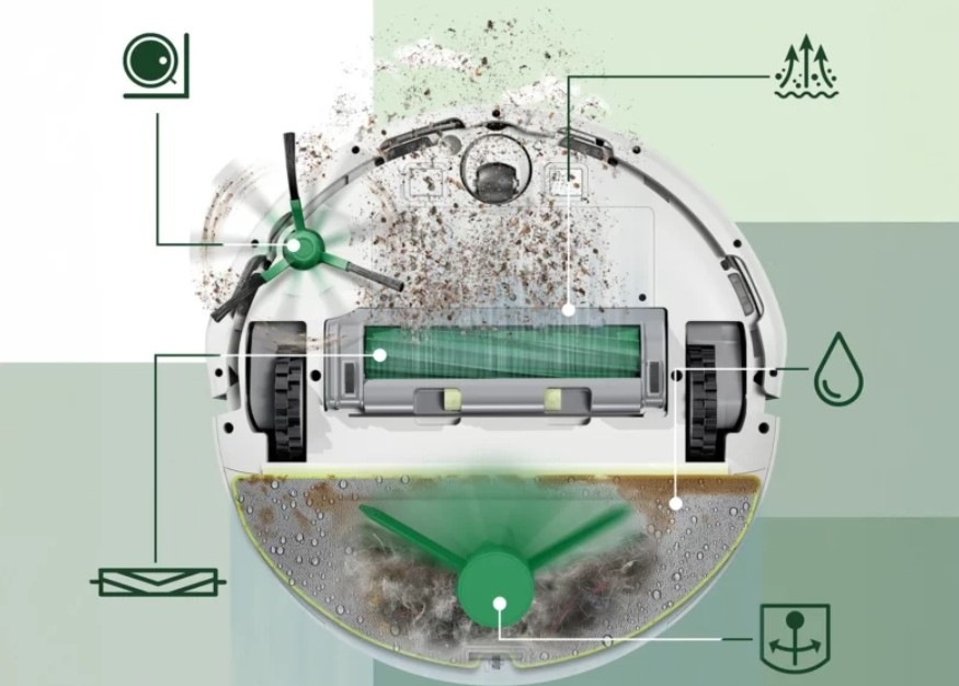 K úklidu využívá vysoký sací výkon 7 000 Pa, což je 70× více než u předchozích modelů. Samozřejmostí je víceúčelový rotační kartáč, který pochytí každou nečistotu. O prostory v hůře přístupných rozích a podél stěn se postará boční kartáček. Integrovaný mop vyčaruje dokonale čistou a lesklou podlahu. Zásluhou mikročerpadla je průtok vody rovnoměrně dávkovaný, takže po něm na podlaze nezůstávají mokré fleky.