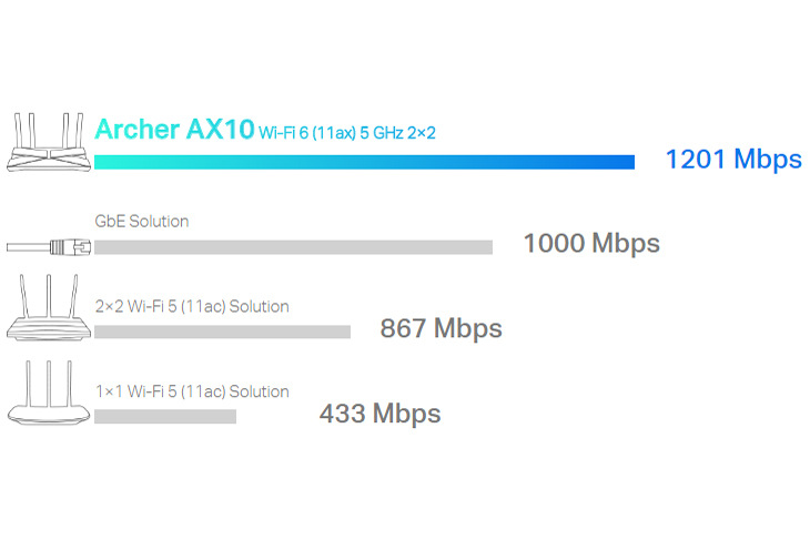 Router pracuje ve dvou pásmech, jež nabídnou kombinovanou rychlost 1,5 Gb/s. To je mnohonásobně více než u předchozího standardu Wi-Fi 5 (867 Mb/s).