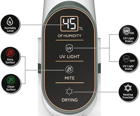 Prémiový LED displej informuje uživatele o následujících údajích: detekovaná úroveň vlhkosti (%), stav UV světel, stav prachového senzoru a funkce sušení.