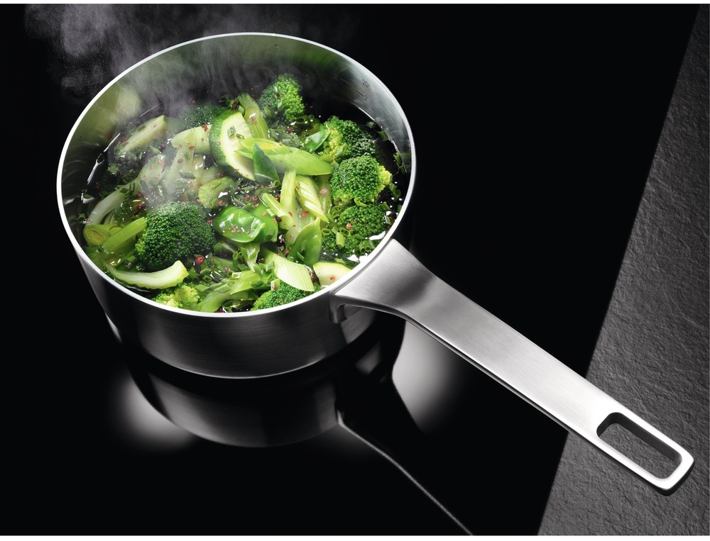 Ukazatel zbytkového tepla vám napoví, zda je varná zóna ještě horká, abyste mohli efektivně využít všechnu energii. Se zbytkovým teplem pracuje užitečný časovač Eco. S funkcí PowerBooster a s maximálním výkonem přivedete vodu k varu během krátkého okamžiku, dokonce rychleji, než by to zvládla rychlovarná konvice. Nastavení varné zóny lze uzamknout dětskou pojistkou. Elegantní povrch varné desky v provedení černého skla a se zkosenou hranou je snadno čistitelný a odolný vůči poškrábání. Na jeho povrchu se nic nepřipálí, postačí ji pouze otřít vlhkým hadříkem.
