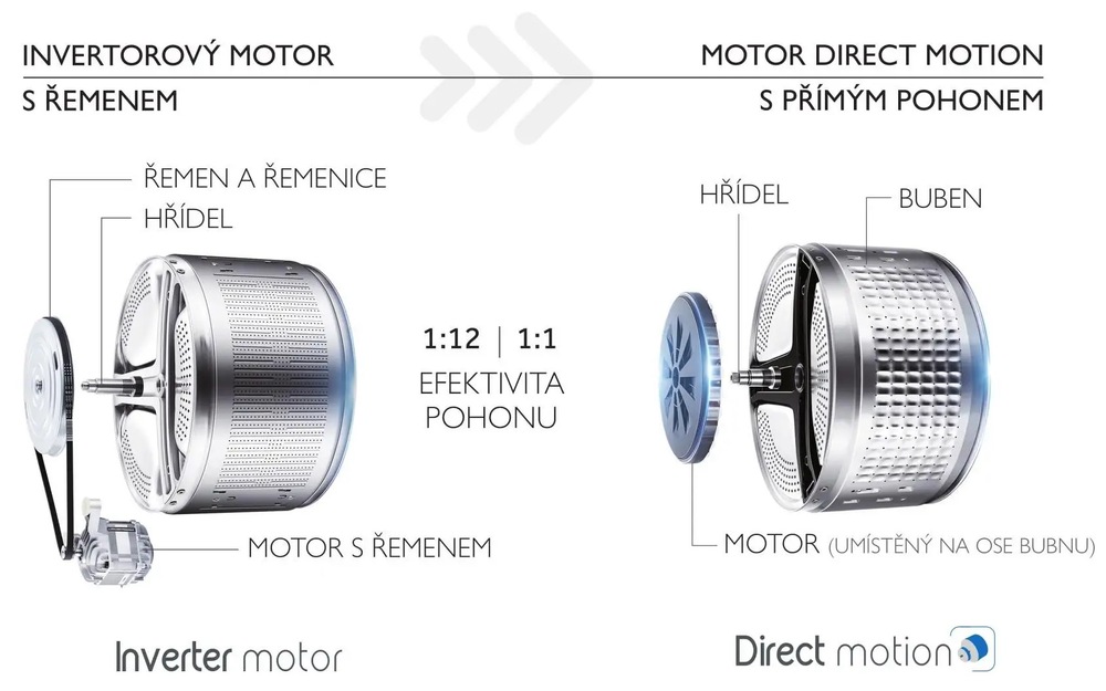 Direct Motion motor s hlučností pouhých 70 dB je jedním z nejtišších motorů na trhu. Motor bez řemene je přímo připojen k bubnu, díky čemuž je výrazně snížen hluk a vibrace, prodlužuje se jeho životnost a zároveň je snížena spotřeba vody a energie.