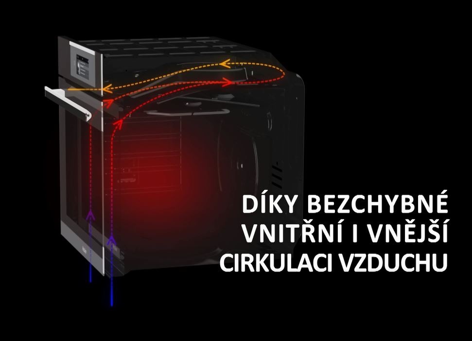 Dokonalé rozložení tepla, vlhkosti a vzduchu ve vaší troubě zajistí dosažení vynikajících výsledků pečení. Díky speciálně tvarovanému panelu šéfkuchaře a proměnlivým otáčkám ventilátoru dosáhnete perfektní výsledky díky bezchybné vnitřní i vnější cirkulaci vzduchu. Radiální umístění chladicího systému ventilátoru udržuje konstantní teplotu uvnitř, aniž by došlo ke ztrátě tepla nebo přehřátí rukojeti, okolního nábytku nebo elektroniky mimo troubu.