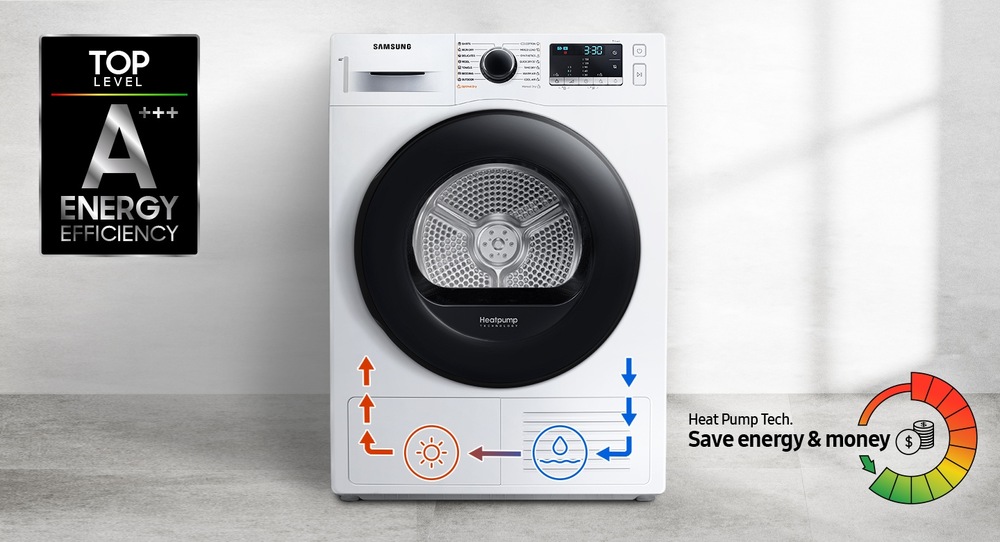 V moderní domácnosti je neskladný sušák na vyprané prádlo minulostí. Pořiďte si sušičku Samsung a ušetřete svůj čas, životní prostředí, spotřebu energie i svou peněženku. Sušička je osazena technologií tepelného čerpadla, které zaručuje energetickou efektivitu a šetrný způsob sušení různých tkanin. Vzduch ohřívá pomocí „chladiva“ a recyklace teplého vzduchu zajišťuje ještě větší úsporu energie, díky čemuž si vysloužila zařazení do energetické třídy A+++.