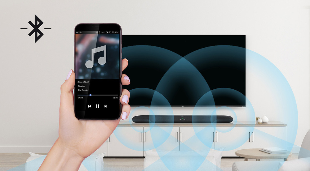 Soundbar je vybaven technologií Bluetooth což znamená, že jej můžete spárovat s různými zařízeními bez využití omezujících kabelů – například se smartphony, tablety, PC či TV.