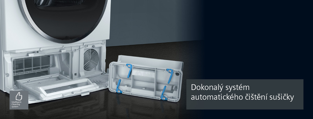 Všechny zbytky různorodých tkanin a vláken, které zůstávají ve filtru, již není potřeba odstraňovat po každém sušení. Systém intelligentCleaning je odvádí proudem vzduchu do spodní části, kde jsou zachyceny sítkem. To se automaticky proplachuje a tkaniny zůstávají ve zvláštním zásobníku. Senzory vás pak upozorní, kdy je potřeba zásobník vyprázdnit. Průběžně to vychází po každém 20. cyklu sušení.