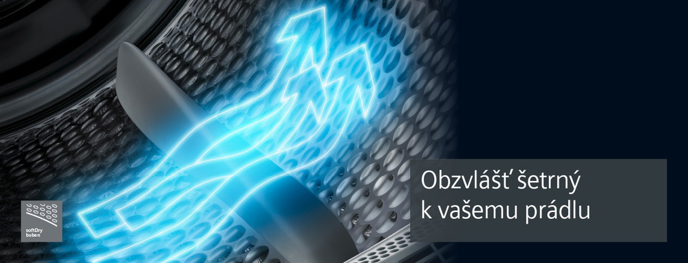 Díky unikátnímu designu softDry je o prádlo v bubnu maximálně postaráno. Stálý proud vzduchu a konstantní teplota zajistí účinné vysušení prádla. Prohnuté unašeče dokonale rozvádí teplý vzduch a ten rovnoměrně koluje v sušičce. Prádlo po povrchu jemně klouže a vysušení je jemné, šetrné a dokonalé.