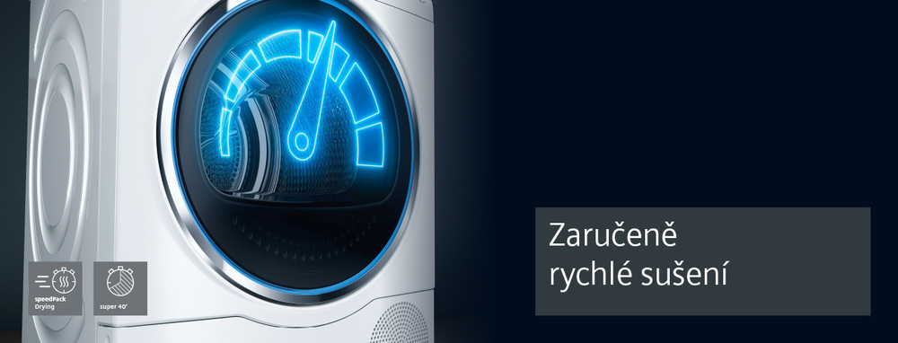 Spěcháte a potřebujete své oblíbené oblečení vysušit rychle? Využijte program super 40´a díky regulované teplotě a přizpůsobené ochlazovací fázi bude prádlo suché za 40 minut. S technologií speedPack dokážete ušetřit čas ve všech programech.