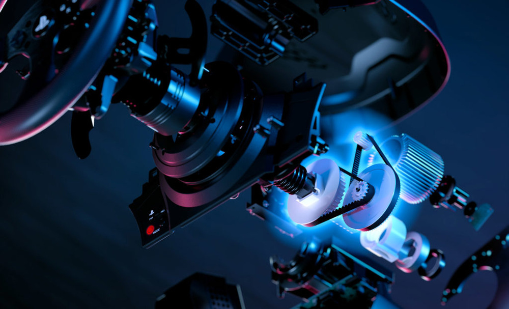 Model T300 využívá dvojitý řemenový mechanismus, který výrazně snižuje mechanický hluk a zajišťuje jemné, plynulé pohyby volantu. Každý přenos z virtuální trati je přesný, ale zároveň tlumený, takže řízení působí přirozeněji a méně trhaně než u řešení s převody.
