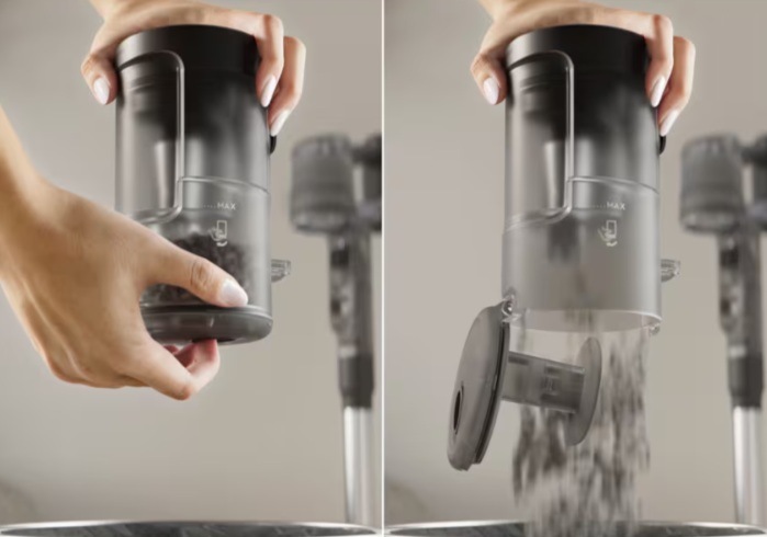 Prachovou nádobku o objemu 0,6 l vyprázdníte snadno a rychle pouze jedním dotykem, aniž by hrozilo, že se její obsah nedopatřením rozsype.