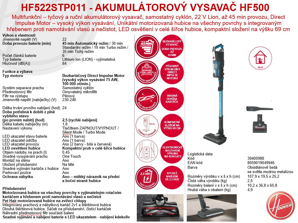 Hoover HF522STP 011 z řady HF500 je multifunkční tyčový akumulátorový vysavač navržený tak, aby poskytoval působivý výkon při vysávání na všech površích a zároveň umožňoval bezproblémovou a rychlou údržbu. Motorizovaná hubice s integrovaným hřebenem zabraňuje namotávání vlasů a chlupů na kartáčovou lištu. Direct Impulse motor zaručuje perfektní sací výkon, zatímco hybridní kartáčová lišta vyrobená ze směsi měkkých a tvrdých štětin nabízí bezchybný výsledek úklidu na jakémkoli povrchu. Kombinace technologie samostatného cyklónu a předmotorového filtru zajišťuje vysoce kvalitní separaci prachu. Díky kompaktním 69 cm ve složeném stavu lze vysavač uložit i do těch nejmenších prostor, jako jsou kuchyňské a obývací skříně. HF500 disponuje intuitivním LED displejem na rukojeti s volbou režimu vysávání a LED indikátory stavu baterie a údržby. Maximální doba provozu je až 45 minut, vysavač má také osvětlení hubice a přídavné příslušenství včetně hubice na zvířecí chlupy.