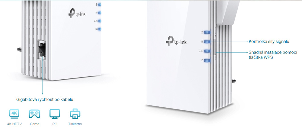 Wi-Fi extender • technologie Wi-Fi 6 • síť Mesh pro širší pokrytí • gigabitový Ethernet • signální světlo pro ideální umístění • režim AP • aplikace Tether • vysoká kompatibilita