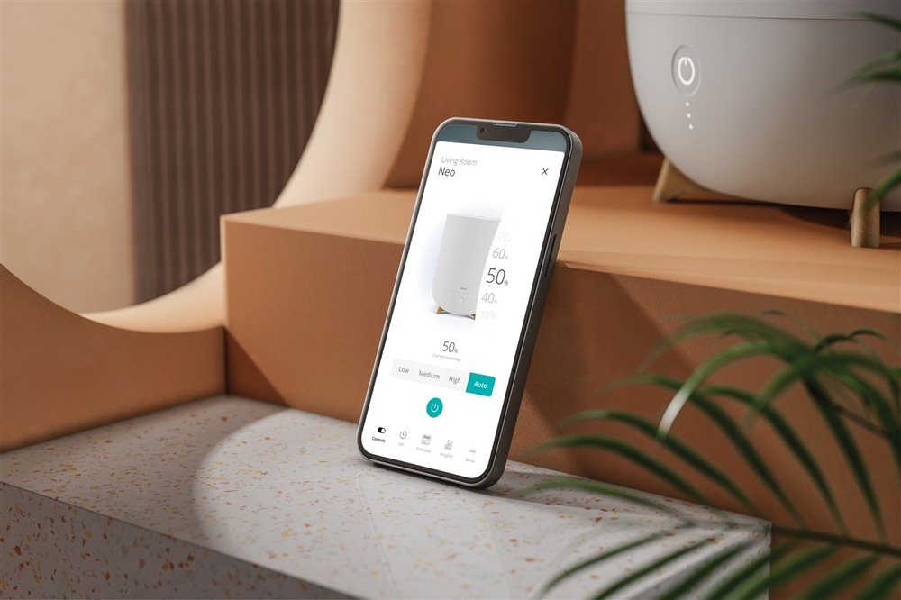 Zvlhčovač je vybaven hygrostatem s rozsahem 30–90 %, který udržuje optimální úroveň vlhkosti. Vybrat si můžete ze tří rychlostí provozu nebo automatický režim, který se přizpůsobí aktuálním podmínkám v místnosti. Ovládá se pohodlně prostřednictvím mobilní aplikace Duux.